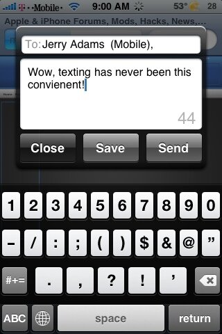 After you start typing in a message, the CALL button turns into a SAVE button, which you can save you message to drafts for sending later or you can press the home key to hide quickSend without clearing text you have entered so far. Upon pressing Volume Up, your message will still be there and you can continue where you left off. It also has a character counter in the corner as well.