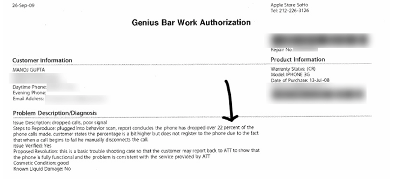 In a diagnosis issued by the Genius Bar, the proposed resolution for the issue was for the customer to contact AT&T, because “the problem is consistent with the service provided” by the wireless carrier. Not included in the report, however, is what a Gizmodo reader claimed he was told by the Apple Store Genius: That a 30 percent dropped call rate is average for the New York area.